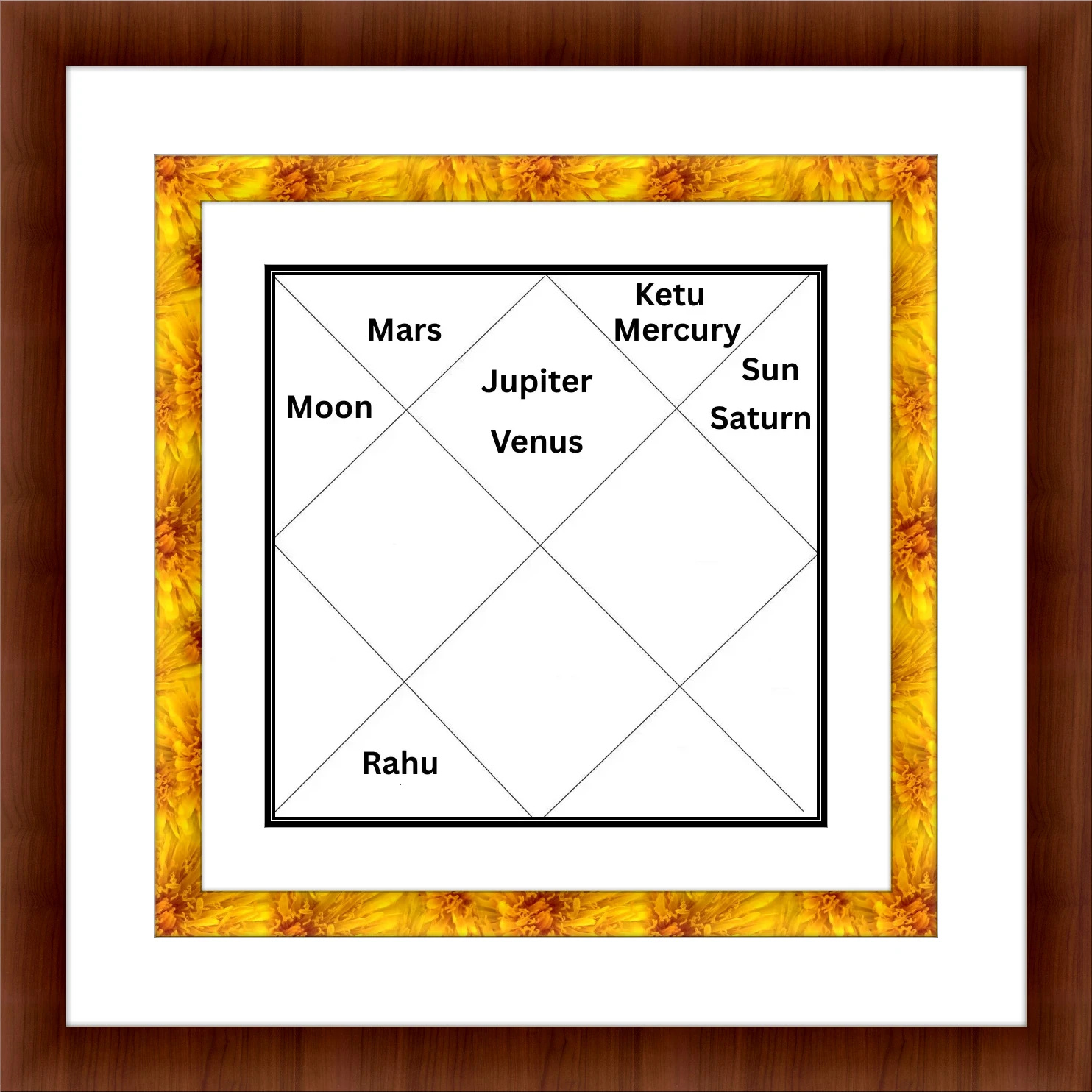 - The person will become a king endowed with vast Army, wealth and conveyances, if Saturn is placed in its uchh bhava (exalted house) i.e. 11th house, Venus and Jupiter are also present in their uchh bhava (exalted house) i.e. 1st house, the Moon is in the 10th house, the Sun is in the 4th house and Mars also occupies its uchh bhava (exalted house) i.e. 2nd house along with Mercury. All house/bhava placements should be taken as per the cusp chart.